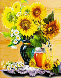 Алмазная вышивка «Букет подсолнухов и ромашек и баночка мёда» 40x50 см